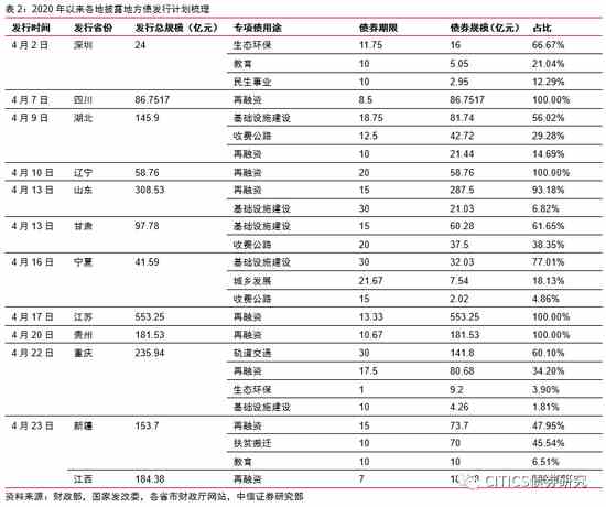 | 来源: CITICS债券研究 文丨明明债券研究团队 原标题:【信视角看债】地方债俯冲蓄力,供给将再上台阶 报告要点 随着年初以来限额逐步释放,4月地方债供给进入俯冲阶段,政策多次推动也在为5月第三批下达的限额提前蓄力。2020年以来地方债资金流向仍以基建民生领域为主,其中流入广义基建占比高达41.73%。整体来看,为了应对经济增速下行的冲击,财政逆周期调节理应持续加码,我们认为加大地方债供给是缓释阶段风险、引入有效资金和维稳国内经济的必要手段之一。 4月地方债规模正常回落,在政策推动下预计5月将保持较高供给。2020年1-4月地方债发行新增总规模1.73万亿元,其中新增一般债5103亿,完成中央提前下达额度91.45%,专项债1.15万亿元,完成中央提前下达的89.14%。4月份地方债发行规模回落较为明显,新增总规模2868亿元,但整体规模相较2019年4月的1093亿元,同比有所增加。其中4月专项债新增规模509亿元,同比增加11.62%。预计后续政策支持下专项债将再次放量,随着第三批一万亿元专项债额度下达,5月份发行将再迎历史高峰。 4月地方债发行价格进一步压降,发行期限拉长。4月地方债发行价格进一步压降至2.90%。分地区发行价格来看,广西和广东发行价格最高为3.59%。4月地方债发行期限中长期期限占比继续提高。至今新增专项债平均发行期限超过15年,其中10年期以上长期债券发行占比38.68%,较去年占比大幅提高10.43%,与往年相比期限更加合理,与项目实际期限更加匹配。根据目前已披露的地方债募集资金用途的发行计划,各省市用途占比最高的仍为基础设施建设。截至目前全部已披露用途中基础设施建设单项超过10351.56亿元。 2020年1-4月,已发行的地方债募集资金用途主要为基础设施建设、社会事业和其它民生领域相关项目。其中,募集资金用于狭义基础设施建设占比约35.51%,加上园区建设、交通基础设施等用途,广义基础设施建设类占比约 41.73%,与去年的土储棚改占重头成鲜明对比。行业细分来看,乡村振兴、生态环保、农林水利、医疗卫生教育也占比较高,地方债对于基建民生领域的财政支持倾斜较为明显。4月当月已发行的地方债募集资金用途主要用于偿还到期地方债,占比84.37%。其他募集资金用途中,包含基础设施和交通基础设施的广义基础设施建设类占比较大,合计占比8.32%。 4月地方债成交额超万亿继续维持高位。以往地方债的成交额占全部债券成交额的比重约5%,近年来保持稳定,从2018年7月溢价改善后成交增幅显著,在2019年3月达到新高,月成交量过万亿,之后逐渐回落,今年3月地方债成交量再度破万,4月成交量也保持在万亿以上,达到12746.25亿元。 债市策略:期限溢价仍具有相对价值,关注货币政策对流动性呵护。疫情在全球蔓延后,全球央行快速反应,虽大幅降息或扩大资产购买规模,但仍然不能阻止悲观情绪的蔓延。全球货币宽松仍难标本兼治。货币要配合财政刺激,进而拉动实际需求,财政后续发力值得期待,而货币政策的安抚也显得尤为重要。 风险因素:货币政策未及时对冲地方债供给风险;市场资金面上行;资金传导不畅导致再融资难度加大等。 正文 增发地方政府专项债反复提及,积极的财政更加积极有为,财政逆周期调节力度加码稳基建。我们对于四月份地方债的发行进行回顾,并对未来地方债发行进行前瞻。 地方债四月最新发行情况跟踪 地方债每月最新政策跟踪 国常会再提提前下达地方专项债额度,带动扩大有效投资。4月14日国务院召开国常会,再提抓紧按程序再提前下达一定规模的地方政府专项债,多措并举加大积极财政政策实施力度。 政治局会议提出以更大的宏观政策力度对冲疫情影响,增加地方政府专项债券。4月17日,中共中央政治局召开会议,会议提出要以更大的宏观政策力度对冲疫情影响。积极的财政政策要更加积极有为,提高赤字率,发行抗疫特别国债,增加地方政府专项债券,提高资金使用效率,真正发挥稳定经济的关键作用。稳健的货币政策要更加灵活适度,运用降准、降息、再贷款等手段,保持流动性合理充裕,引导贷款市场利率下行,把资金用到支持实体经济特别是中小微企业上。 ![]() 四月地方债发行规模回落 4月地方债规模正常回落,在政策推动下预计5月将保持较高供给。2020年1-4月地方债发行新增总规模1.73万亿元,其中新增一般债5103亿,完成中央提前下达额度91.45%,专项债1.15万亿元,完成中央提前下达的89.14%。4月份地方债发行规模回落较为明显,新增总规模2868亿元,但整体规模相较2019年4月的1093亿元,同比有所增加。其中4月专项债新增规模509亿元,同比增加11.62%。预计后续政策支持下专项债将再次放量,随着第三批一万亿元专项债额度下达,5月份发行料将再迎历史高峰。 ![]() 四月地方债发行价格继续下降 4月地方债发行价格进一步压降至2.90%。地方债发行价格从2015年至今年呈震荡走势,发行利率在2016年10月达到最低点2.68%,最高点在2018年2月达到4.32%,2019年以来地方债发行利率呈现下降趋势,发行成本有所降低。进入2020年,地方债发行价格进一步下降,从2019年末的3.7%持续下降到2020年4月的2.90%。 ![]() 分地区发行价格来看,广西和广东发行价格最高为3.59%。4月东中西各地区均有省份发行地方政府债,已公布发行利率的地方政府债中宁夏发行利率最低。我们统计了2020年以来各省地方债加权平均发行票面利率,34