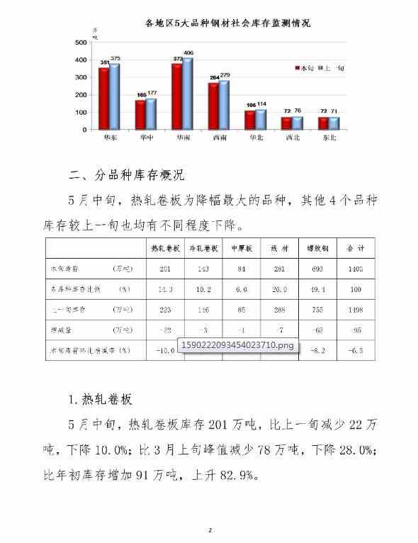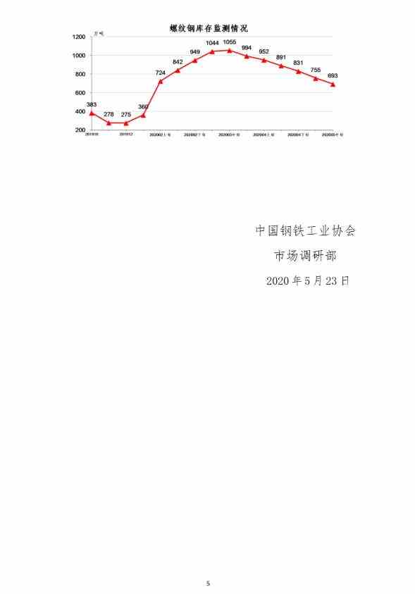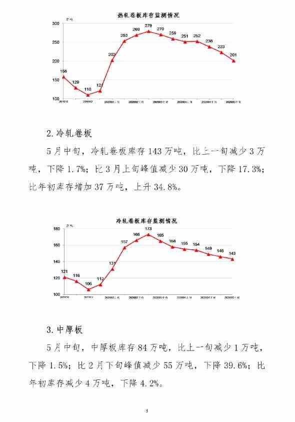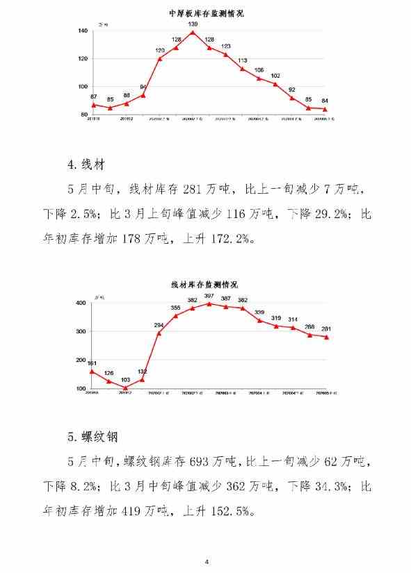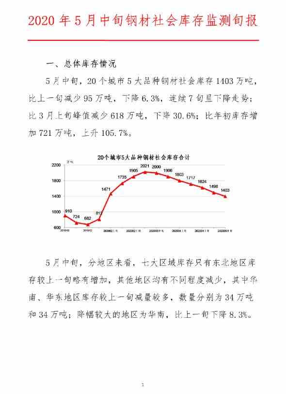 5月中旬,20个城市5大品种钢材社会库存1403万吨,比上一旬减少95万吨,下降6.3%,连续7旬呈下降走势;比3月上旬峰值减少618万吨,下降30.6%;比年初库存增加721万吨,上升105.7%。