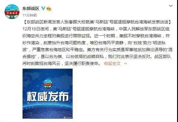 | 原标题:美舰夜穿台海,东部战区海空兵力全程跟踪监控 东部战区回应美舰穿航台湾海峡:全程跟踪监视,时刻瞰视台海风云。 12月18日夜间,美“马斯廷”号驱逐舰穿航台湾海峡,中国人民解放军东部战区组织海空兵力全程对美舰进行跟踪监视。近一个时期,美舰不时穿航台湾海峡,并炒作渲染,刻意抬升台海问题热度,唯恐台海风平浪静,向“台独”势力“明送秋波”,严重危害台海地区和平稳定。美方有关行为实质是军事炫武加舆论误导的“混合操控”,是以台为棋、以台做局的战略自私,我们对此表示坚决反对。战区部队将时刻瞰视台海风云,坚决履行职责使命。 ![]()