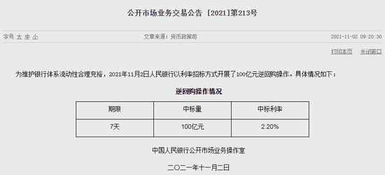 11月2日,中国央行今日开展100亿元逆回购操作,因今日有2000亿元逆回购到期,当日实现净回笼1900亿元。