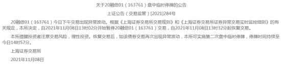 快讯:11月8日,“20融信01”(163761)盘中临时停牌,停牌前跌超22%