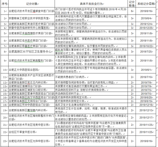 1月10日,合肥市卫生健康委员会公布了2019年合肥市本级(含开发区)医疗机构及医务人员不良执业行为记分情况名单。据悉,合肥市医疗机构及医务人员的不良执业行为将被记分,一年为一个记分周期,凡是记满24分,医疗机构在办理校验时将“暂缓校验”,面临停业风险,而医务人员则面临低聘、解职待聘、解聘等处理,而且医师定期考核为不合格,暂停执业活动。(安徽商报融媒体记者张永) 具体名单如下: ![]() ![]() ![]() (责任编辑 王彤欣) |
