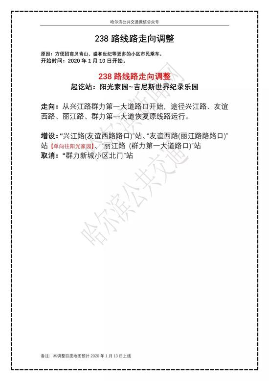 目前,部分站牌还没有安装,“群力新城小区北门”站的238路站牌还没有撤掉,请乘客乘车时注意。