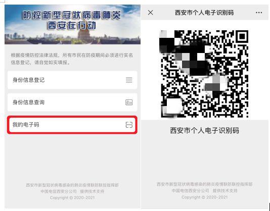 当前,我市新冠肺炎疫情防控工作已进入关键时期,经市联防联控指挥部批准,由市大数据资源管理局牵头,中国电信西安分公司开发部署,西安市个人电子识别码(简称“一码通”)正式上线试运行。 特点 多应用场景:市民通过在线获取电子码,一人一码,作为进出社区小区、商超、写字楼等公共场所通行凭证,手机亮码即刻通行。 多渠道入口:具有“i西安”APP、微信、支付宝、钉钉等多种入口,操作简便快捷。 多角色适用:面向不同角色配置不同职责,有效解决各种登记和验证需求。 面向广大市民群众 在出入居住社区小区、商超等公共场合时,可通过“西安市民电子识别码平台”——“我的电子码”作为出入凭证。 面向广大工作人员 为社区小区、科技园区、商务楼宇疫情防控工作提供高效支撑,防控人员可以通过扫描用户出示的“我的电子码”进行核查登记,方便快捷。 具体操作如下 场景一:如何进入平台 方式一: 长按下方图片,选择“识别图中的二维码”,进入“西安市民电子识别码平台”进行登记注册。 ![]() ![]() 市民也可通过微信、支付宝、钉钉等的“扫一扫”功能,扫描识别以上二维码进入”西安市民电子识别码平台”进行登记注册。 方式二: 长按下方图片,选择“识别图中的二维码”,进入[西安大数据]公众微信平台,点击菜单栏“政民互动”——“‘一码通’申领”,进入“西安市民电子识别码平台”进行登记注册。 ![]() ![]() ![]() 场景二:如何注册申领 1。进入“西安市民电子识别码平台”后,选择“身份信息登记”。 ![]() 2。 根据界面显示的相关信息进行填写,填写完成点击“提交”。 ![]() 3。 信息登记完成后,系统会自动生成“西安市个人电子识别码”。 ![]() 场景三:如何提取使用 用户可点击“我的电子码”获取 “西安市个人电子识别码”。 ![]() 扫一扫 进入“西安市民电子识别码平台”