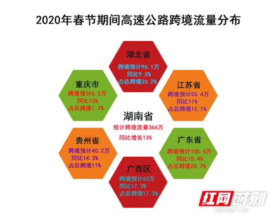 自正月初二、初三开始,短途探亲车流增长迅猛,主要以长沙及各市(州)城市为中心向周边县市、乡镇发散,初四至初六,各县市、乡镇车流向重点城市为中心汇聚,呈现返程高峰。 预计2020年春节期间全省高速公路出入口通行车辆总数为2686万辆,日均流量383万辆,是平日的2.2倍。峰值日预计出现在正月初六(1月30日),峰值日流量将再创新高,可能突破500万辆,是平日的2.9倍。 春节假期跨境流量约为366万辆 根据预测,春节假期跨境流量约为366万辆,较去年增长13%。 预计2020年春节期间,往返湘粤车辆总数约为105.4万辆,较去年增长15.4%,约占春节跨省车辆总数的28.7%。日均流量为15万辆,峰值出现在正月初六,预计湘粤跨境峰值达28万辆。湘粤跨境通道流量从高到低依次排序是:京港澳高速小塘门架(40.7万),二广高速南风坳门架(27.4万),武深高速九龙江门架(21.3万),许广高速堡城门架(15.9万)。 ![]() 往返湘鄂的车辆总数约为96.1万辆,较去年增长9.54%,占春节跨境车辆总数的26.2%,日均流量13.7万。由于湘鄂省际收费站较多,运行态势与往年相同,预计峰值出现在正月初六,湘鄂跨境峰值流量为15.9万辆。湘鄂跨境通道流量从高到低依次排序是:二广高速城头山门架(23万),京港澳高速羊楼司门架(20万),许广高速道仁门架(14.5万),杭瑞高速大界门架(13.3万)、张南高速湘西北门架(10.8万)、华常高速华容北门架(8.6万)、武深高速冬塔门架(5.9万)。 往返湘赣的车辆总数约为55.4万辆,较去年增长11%,占春节跨境车辆总数的15.1%,日均流量7.9万。预计峰值出现在正月初六,湘赣跨境峰值流量为12.5万辆。湘赣跨境通道流量从高到低依次排序是:沪昆高速金鱼石门架(29.5万)、泉南高速高陇门架(7.8万)、浏洪高速洪口界门架(5.7万)、杭长高速张坊门架(5.6万)、厦蓉高速热水门架(5.1万)、莆炎高速炎陵门架(1.7万)。 往返湘桂的车辆总数约为63万辆,较去年增长17.3%,占春节跨境车辆总数的17.2%,日均流量9万。预计峰值出现在正月初六,湘桂跨境峰值流量为15.5万辆。湘桂跨境通道流量从高到低依次排序是:泉南高速枣木铺门架(21.9万)、厦蓉高速永安关门架(12.2万)、永贺高速永济亭门架(11.6万)、包茂高速通道门架(10.3万)、呼北高速崀山门架(7万)。 往返湘黔的车辆总数约为40.2万辆,较去年增长14.35%,占春节跨境车辆总数的10.9%,日均流量5.7万。预计峰值出现在正月初六,湘黔跨境峰值流量为8.7万辆。湘黔跨境通道流量从高到低依次排序是:杭瑞高速凤凰西门架(27.3万)、沪昆高速新晃门架(12.9万)。 往返湘黔的车辆总数约为6.2万辆,较去年增长12%,约占春节跨省车辆总数的1.7%,湘渝间仅有一个省际站,路网运行态势与往年相似。 春节期间易堵节点 节假日公众出行需求越来越旺盛,特别是春节假期,对小型客车实施免费通行政策,易导致路网出现缓行和拥堵。 省内预计易缓行路段为:G5513长张高速长益段、S50长芷高速长沙段、G4京港澳高速郴州南段、G60沪昆高速与G6021许广高速交汇的塔岭枢纽互通路段、G60沪昆高速梽木山枢纽至隆回路段、G6021杭长高速永安段、G0422武深高速炎陵西枢纽互通路段。出行者需提前了解假期交通拥堵情况,合理安排出行,避开流量高峰及拥堵路段,错峰出行,或选择绕行路径。 易拥堵收费站为:G4京港澳高速临长段广福、星沙、平江西、岳阳收费站,长潭段雨花、李家塘、昭山、马家河收费站,潭耒段株洲西收费站,耒宜段郴州收费站;G5513长张高速长益段长沙西、朝阳收费站;G60沪昆高速潭邵段邵阳南、周旺铺、邵东收费站;G6021杭长高速长永段长沙、三一、黄花、永安收费站;G0401长沙绕城高速松雅湖、长龙、干杉、鹿芝岭、黄花塘、坪塘、大托、洞井、万家丽南、捞刀河、新港、星城、金桥、万家丽北收费站;G0421许广高速潭衡段杨嘉桥收费站,桂武段舂陵江收费站;S50长芷高速岳麓收费站;S21长株高速榔梨东收费站;S01韶山高速韶山站;S41长潭西高速学士收费站;机场高速长沙东站。 易拥堵服务区为:G4京港澳沿线各服务区(小塘、宜章、苏仙、永兴、耒阳、雁城、衡山、昭山、长沙、大荆、临湘等服务区);G60沪昆高速沿线服务区(金鱼石、湘潭、邵东、宝庆、隆回、洞口等服务区);G5513长张高速长益段的宁乡、益阳服务区;以及G55二广高速的蓝山、九嶷山、宁远北、阳明山、零陵和邵阳等服务区。 易拥堵枢纽互通为:G60沪昆高速与G0421许广高速交汇的塔岭枢纽互通,G4京港澳高速与G60沪昆高速交汇的殷家坳枢纽互通,G5513长张高速与G0421许广高速交汇的简家坳枢纽互通,S50长芷高速与G0421许广高速交汇的道林枢纽互通, G60沪昆高速与G55二广高速交汇的梽木山枢纽互通, G6021杭长高速与G0401长沙绕城高速交汇的黄花枢纽互通,G6021杭长高速与G4京港澳高速交汇的长沙北枢纽互通,G4京港澳高速与G0401长沙绕城高速交汇的李家塘枢纽互通, G60沪昆高速与G65包茂高速交汇的竹田枢纽互通,G0422武深高速与G1517莆炎高速交汇的炎陵西枢纽互通。 此外,春节假期期间,中短途旅游车辆会比较多,目的地多为省内热门景区,提醒湘潭韶山、南岳衡山、凤凰景区、张家界武陵源景区周边路段或将有较大的流量压力。此外湖南通往湖北赤壁、广西龙胜、江西宜春,省内宁乡灰汤、郴州汝城和张家界江垭温泉等景区周边的高速也将是出行热点路段。 特别提醒,预计春节假期期间,前往韶山瞻仰伟人故里和前往南岳衡山祭祀的游客