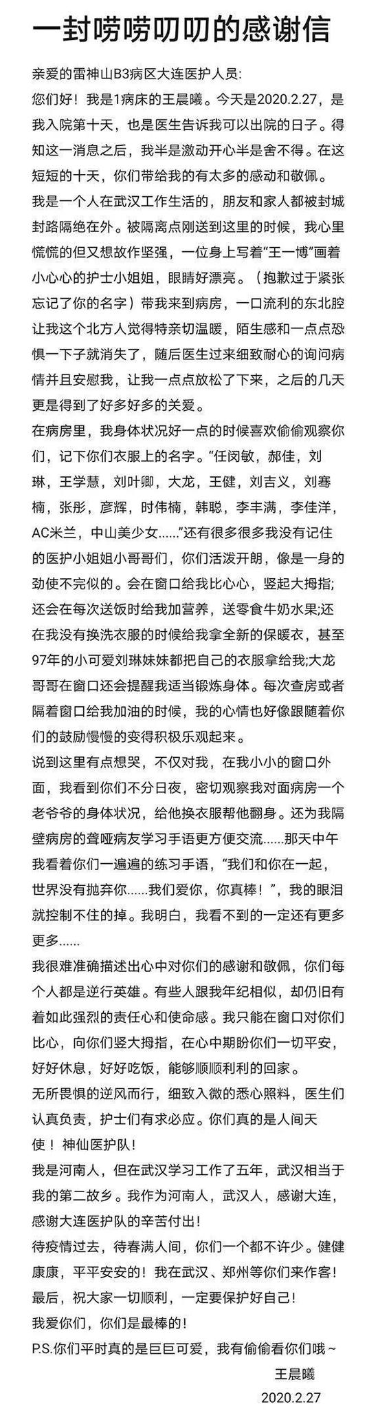 ![]() 还记得那个在雷神山医院的隔离病房里,用平板电脑画出一幅大连武汉连心桥”的可爱女孩吗? 在这次疫情中,女孩感染了新冠肺炎病毒,并被雷神山医院收治。因为来自大连大学附属中山医院的90后男护士任闽敏对她无微不至的照顾,更因为全体大连医护人员对她的精心治疗护理,女孩被感动了。尤其是任闽敏和同事赫佳为了鼓励她,还隔着病房玻璃窗和她一起“花式比心”。本来心情低沉的女孩受到鼓舞,用一天时间创作了一副武汉长江大桥和大连星海湾大桥的“连心桥”画作,感动了很多大连网友。 女孩叫王晨曦,是一个在武汉上了四年大学,毕业后留在武汉工作的河南姑娘。经过医生护士的精心治疗照顾,这位在雷神山医院B3病区住院的女孩,已经于2月27日康复出院了! 这是我入院的第十天也是我重获新生的日子!小王说,自己一个人在武汉工作生活,朋友和家人都被封城封路隔离在外。“被隔离点刚刚送到这里时,我心里确实很慌张,又想故作坚强。”但是小王发现,雷神山医院里一位漂亮护士说着一口流利的东北腔。“这让我感到格外亲切温暖!陌生感和恐惧感很快就消失了。” 小王说,自己在身体状况好转时,会偷偷观察照顾自己的医生护士们,并偷偷记住他们的名字。“每个人都包裹在厚厚的防护服后面,口罩遮挡了他们的容颜,但是我会记住你们的名字,记住你们从眼神里透露出的关爱和善良。”小王说,这些来自辽宁来自大连的医护人员会在窗口“比心心”,还会给她加餐补充营养,会把随身衣服带给没有换洗衣服的自己....“一想到这些,我就忍不住要掉眼泪!” ![]() 要康复出院了,小王很舍不得这些医生护士“哥哥姐姐”们,她写下了一封数千字的感谢信,讲述自己的感恩之心。 ![]() 在信中,小王说自己能记住照顾自己的一个个“白衣天使”的名字。我爱你们,你们是最棒的! 在信中小王说:我很难描述出心中对你们的感谢和敬佩,你们每个人都是你英雄,我只能在窗口对你们比心,向你们竖起大拇指,在心中期盼你们一切平安,好好休息,好好吃饭,希望你们能顺顺利利地回家!待疫情过去,待春满人间,你们一个都不许少,健健康康,平平安安的! 来源:大连晚报 |