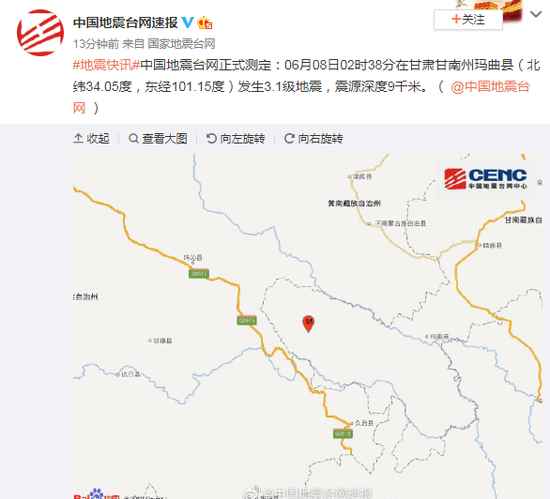 中国地震台网正式测定:06月08日02时38分在甘肃甘南州玛曲县(北纬34.05度,东经101.15度)发生3.1级地震,震源深度9千米。( @中国地震台网 )