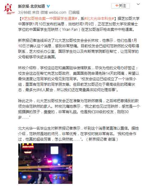 原标题:芝加哥枪击案一中国留学生遇害,系北大光华本科生 据芝加哥大学中国学联1月10日发布的消息,当地时间1月9日,正在芝加哥大学攻读博士学位的中国留学生范轶然(Yiran Fan)在芝加哥连环枪击案中中枪遇害。 新京报记者连线采访了北大芝加哥校友会会长林牧,他表示,他们也是1月10日才确认这个消息,感到非常悲痛。目前校友会已经和范轶然的父母取得联系,芝大校长办公室、国际学生处以及布斯商学院都在帮忙,让范同学的父母能够尽快赶去美国。 林牧介绍称,学校这边在和美国驻华使馆联系,尽快为他的父母办好签证;校友会这边在帮忙向芝加哥政府、美国国务院申请免除14天的隔离,希望以最快速度让范同学的父母见到范同学。“校友会这边已经成立了一个治丧小组,里面有范同学的同学朋友等。但目前芝加哥还处于最高级别的隔离状态,最多允许6人聚会,所以我们还在商量具体如何处理后事”。 除此之外,北大芝加哥校友会正在准备为范轶然募捐,之后将把募捐到的款项交给范轶然的家人。林牧沉痛地表示,“我之前也见过范轶然,感觉是一个挺腼腆的孩子,瘦瘦的,非常有礼貌。他是我们08级的校友,刚刚30岁……” 北大光华一名毕业生对新京报记者表示,听到这个消息简直难以置信。据她介绍,范轶然是她的师兄,非常优秀,在学校时就非常有名。“我和他合作过,他真的超级厉害,怎么突然就……”。(新京报记者 谢莲) ![]() 新闻热点精选