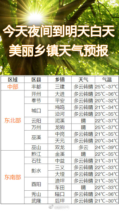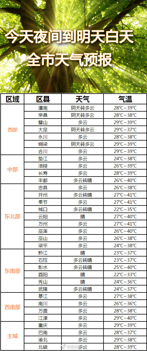 【周一继续晒】今天夜间到明天白天:多云,沙坪坝、江北、南岸、渝中、大渡口、九龙坡,29-39℃;巴南28-37℃;渝北29-38℃;北碚28-39℃。(全市各地及#重庆18个美丽乡镇#未来24小时天气详情请戳图)