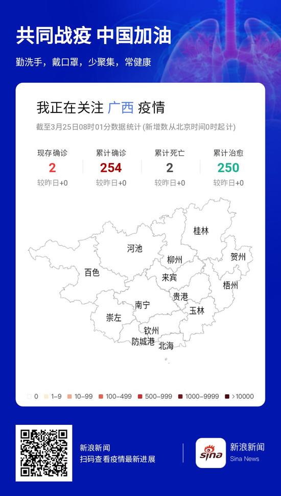 3月24日0至24时,我区无新增确诊、疑似病例,无新增死亡病例。全区累计报告确诊病例254例,其中2例境外输入确诊病例现在定点医院隔离治疗,治愈出院250例,死亡2例。