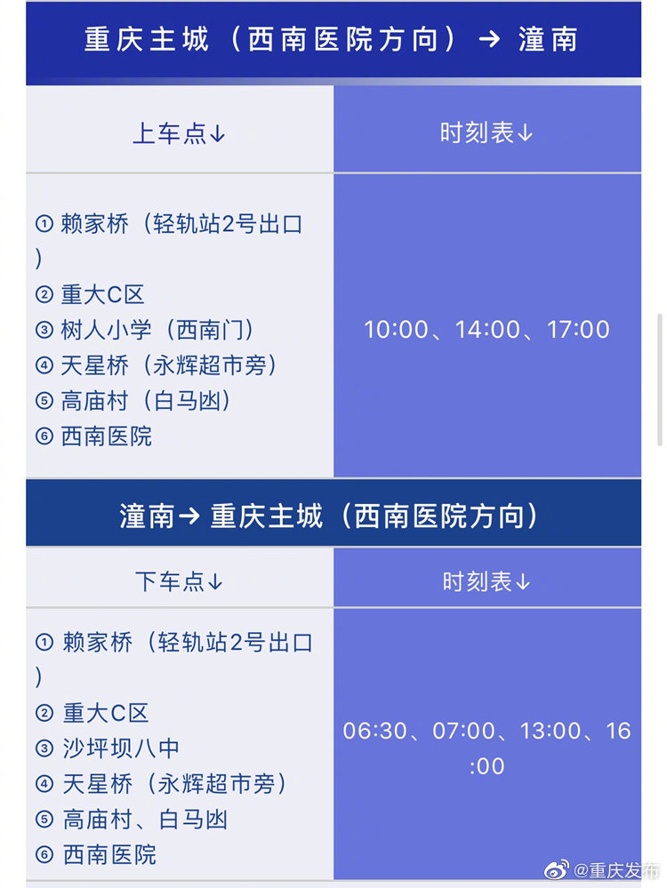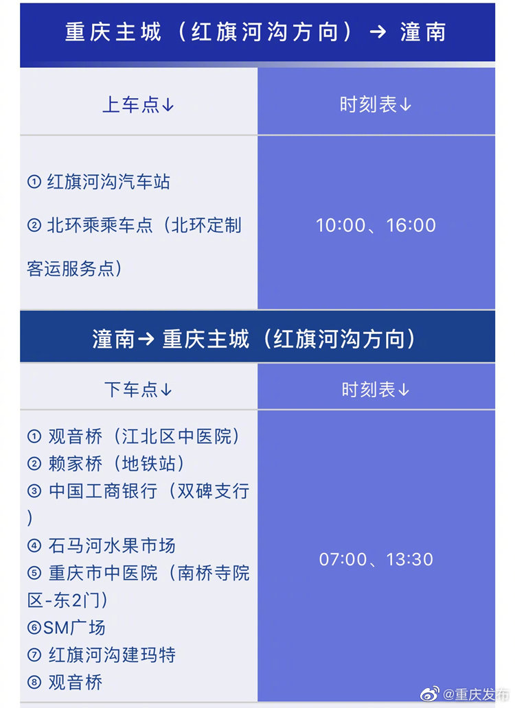 城际快客-渝潼专线在重庆主城定点上下客,潼南城区指定范围内免费接送。具体如下↓↓↓