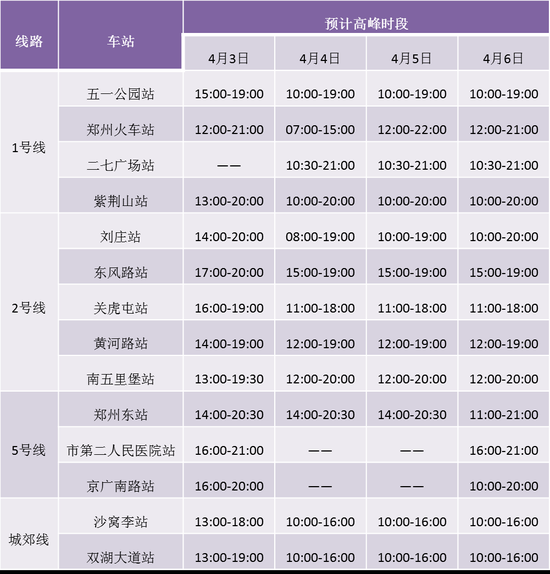 来源:郑州地铁 原标题:《清明假期,郑州地铁缩短高峰时段行车间隔》 随着郑州市复工复产有序推进,为助力郑州市经济秩序全面恢复,郑州地铁提前筹划、科学组织,在确保疫情防控措施到位的基础上,缩短行车间隔、降低乘客乘车密度,为服务广大市民乘客节假日出行提供交通运输服务保障。 郑州地铁自4月3日起缩短行车间隔。工作日期间,1号线高峰期行车间隔压缩至约4分钟、2号线高峰期行车间隔压缩至约4分半、5号线行车间隔仍为8分钟,城郊线高峰期行车间隔压缩至约13分。周末及节假日期间,1号线、2号线、5号线行车间隔约8分钟,城郊线行车间隔约16分钟。14号线一期暂不恢复运营。郑州地铁将密切关注客流变化,适时组织备用列车上线,提升客流高峰时期运力,保障市民乘客安全、顺畅出行。 ![]() 清明节期间,受短途旅游、返乡探亲等因素影响,临近商圈及交通枢纽车站的客流将有一定幅度增长,预计紫荆山站、黄河路站、南五里堡站、五一公园站等换乘站客流涨幅较大。预计4月3日(假期前一天)下午,线网客运量将逐渐增大,晚高峰将提前至15:00,且将持续至21:00。预计4月6日(假期最后一天)客流高峰将从10:00持续至21:00。请广大市民乘客配合车站工作人员引导,有序排队候车。 ![]() 为保障乘客出行便利,重点车站在出入口通道、站厅增设扫码区,便于大家提前扫码验证,设置客流警戒线、制作排队“小脚丫”标识、优化安检通道控制,增加工作人员及时疏导,保障乘客乘车安全同时兼顾通行效率。全线网车站为有需要的乘客提供爱心轮椅、爱心手推车、晶晶安检篮、母婴护理台、爱心接力服务等暖心举措。 ![]() 郑州地铁提前做好物资调配、安全检查、培训演练等各项准备工作,抓紧抓实抓细各项防控工作。同时做好车辆、通号、机电、供建等设施设备精简细修以及应急处置各项准备工作,确保设施设备运行状态良好。 ![]() 清明节期间,郑州地铁严格落实 “三逢原则”,提高安全检查质量,加大车站重点部位安保巡逻、巡视工作,做好车站安全保卫工作。 ![]() 疫情还未完全解除,请广大市民乘客不要参加聚集出行祭扫活动;少扎堆、不聚集,乘车全程戴口罩,做好自我防护;提前规划出行时间,错峰错时出行!记得持续关注郑州地铁官方微博、及运营服务网站获取最新运营信息。 这些车站客流较大