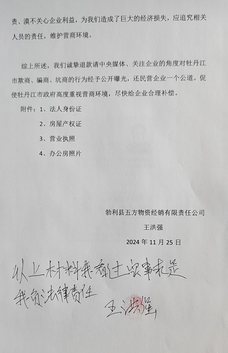 | 是谁破坏了营商环境? 黑龙江省牡丹江市欺商、骗商、坑商谁来管? 尊敬的各位领导,您们好: 我是勃利县五方物资经销有限公司总经理王洪强,联系方式:13904674789。 公司营业执照 2016年初牡丹江城市投资集团有限公司,按照按照(牡政字{2014}5号)文件要求,对位于牡丹江市北平路爱民400-475-3/2-000201,勃利县五方物资经销有限责任公司的839.96平方米的办公用房实施征收。经与征收部门牡丹江城投公司总经理宋景东及副经理刘君文等领导反复协商,同意就近安置商服楼。 产籍图 双方同时约定:一是在原址100米内安置商服楼;二是.该房屋即日起不得转让、租赁、抵押和维修使用。三是即日起该将房屋空出,等待随时拆除。协议达成后,我们多次去牡丹江城市投资集团了解情况,主张权利,但征收部门的答复是:“开发单位暂未建设,待建设使用时再拆除。”就这样,一拖就是八年时间,我们感到对此动迁,无期无望,直到今年8月24日我们找到城投公司领导王女士,手机号码:13359562833,回答我们此事没有计划、没有期限,也没有时间处理,该处理方式给我公司造成了巨大的经济损失。 房屋产权证 1.我公司房屋在原职业技术学院的办公楼内二楼,从动迁开始时就不允许转让、租赁、抵押,使房屋白白闲置七年多时间。在此期间城管环卫部门取消垃圾存放点和垃圾箱,其他部门停止供水供电使企业无法正常生存。 2.由于动迁政策不允许我公司转让、抵押、对我公司的融资造成了影响,银行无法抵压贷款,我们只能到社会高息贷款,受到较大经济损失。 3.公司资产闲置,征收部门漠不关心,从不积极帮助解决,使我们对政府征收政策和政府公信力感到特别失望 。 办公房照片,停水停电停用至今8年了 1.按约定在100m范围内给付900m2的商服楼(含公摊面积补偿)或按每乎方米13600元价格给予货币补偿即900m2x13600元/m2=1224,000元。 2.赔付各项经济损失150万元两项合计补偿1374万元(壹仟叁佰柒拾肆万元) 三、几点要求 牡丹江市政府及动迁部门对此动迁工作不作为、慢作为、敷衍塞责、漠不关心企业利益,为我们造成了巨大的经济损失,应追究相关人员的责任,维护营商环境。 综上所述,我们诚挚退款请中央媒体、关注企业的角度对牡丹江市欺商、骗商、坑商的行为经予公开曝光,还民营企业一个公道。促使牡丹江市政府高度重视营商环境,尽快给企业合理补偿。 勃利县五方物资经销有限责任公司 王洪强 2024年11月25日 |