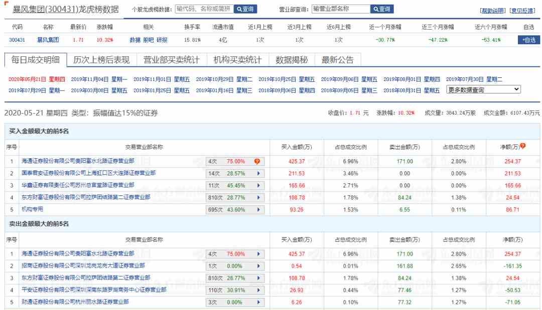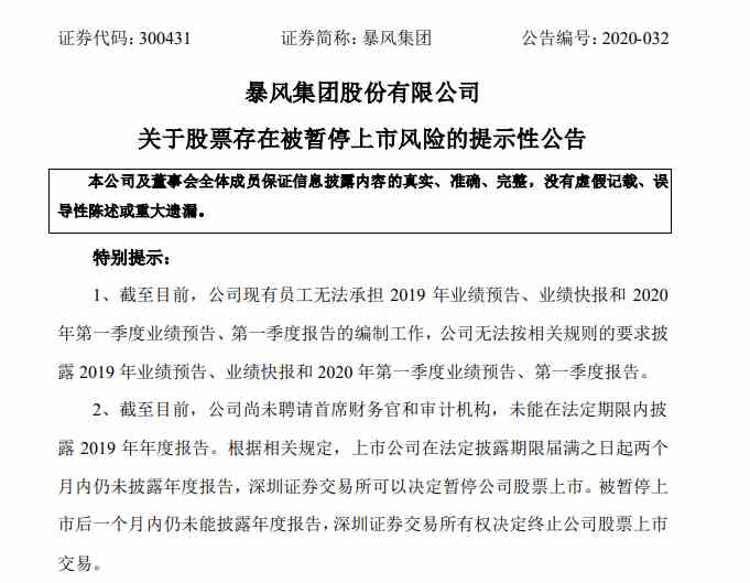 原标题:谁在刀口舔血?再度被立案后,暴风集团(维权)涨停回应,昔日400亿龙头股游走退市边缘![]() 昔日市值400亿的传媒龙头股,如今正游走在退市的边缘。 5月20日晚间,暴风集团发布公告称,收到证监会调查通知书。因未按期披露定期报告,涉嫌信息披露违法违规,证监会决定对暴风集团进行立案调查。此前,暴风集团因涉嫌信息披露违法违规,曾在2019年9月被证监会立案,至今尚未公布调查结果。 在遭遇二度被立案后,5月21日,暴风集团开盘大跌,跌幅一度超过6%,盘中创下历史最低价1.45元/股。令人难以想象的是,午间开盘后,暴风集团忽现大量买单,迅速冲击涨停。截至5月21日收盘,暴风集团当日报收1.71元/股,涨幅10.32%,振幅达到15%。 ![]() 在疫情的影响下,爽约2019年年报的上市公司数量颇多。然而,目前仍未聘请审计机构、亦未作出年报延期安排的A股公司,就只有暴风集团一家。由于目前暴风集团公司员工只有十余人,定期报告的编制也无从谈起。在现有人手和资金几近告罄之下,证监会的介入调查或许能为这一僵局带来转机。 暴风集团喜提一日涨停 对于一家实控人锒铛入狱、持续经营困难、高管全部辞职,仅余10来名员工维持的上市公司,是否有投资者心甘情愿“买单”? 在A股市场上,偏偏一切皆有可能。5月21日,早已处于风雨飘摇之中的暴风集团喜提涨停板一块,并登上当日龙虎榜。 就在前一日晚间,暴风集团刚刚发布了一起颇为悲催的消息:因未按期披露定期报告,涉嫌信息披露违法违规,证监会决定对暴风集团进行立案调查。暴风集团表示,在调查期间,其将积极配合调查工作,并严格履行信息披露义务。同时,暴风集团提示广大投资者理性投资,注意风险。 5月21日,暴风集团开盘大跌,跌幅一度超过6%,盘中创下历史最低价1.45元/股,走势符合市场预期。 ![]() 不过,令人难以想象的是,午间开盘后,暴风集团忽现大量买单,迅速冲击涨停。截至5月21日收盘,暴风集团当日报收1.71元/股,涨幅10.32%,振幅达到15%。目前,暴风集团A股市值为5.63亿元,与其巅峰时期的400亿元市值相比,已经跌去98%。 当日龙虎榜数据显示,大量游资杀入抄底暴风集团,买入前五营业部合计买入1004.61万元,占比16.45%。其中,海通贵阳富水北路营业部当日买入425.37万元,总成交占比6.96%。此外,前五席位中也有机构席位的身影。 ![]() 游走在退市边缘 此次暴风集团遭遇二度立案,可算是“一波未平,一波又起”。 在此之前,2019年9月,由于涉嫌信息披露违法违规,暴风集团已先行接到一份证监会的调查通知书。不过,该次调查至今未有结果落地。 在新《证券法》落地后,A股市场上因涉嫌信披违法违规而遭到立案调查的上市公司数量不断增加。证监会主席易会满在“5·15全国投资者保护宣传日”强调,对于违法行为开始于3月1日前,目前仍在持续发生和产生危害的,将严格按照新《证券法》规定严加惩治。 事实上,在疫情的影响下,爽约2019年年报的上市公司数量颇多。然而,目前仍未聘请审计机构、亦未作出年报延期安排的A股公司,就只有暴风集团一家。由于目前暴风集团公司员工只有十余人,定期报告的编制也无从谈起。 回顾以往,2019年年中,暴风集团实控人冯鑫传出失联消息,其公司业务也陷入窘境。2019年9月,冯鑫正式被上海市静安区检察院以涉嫌对非国家工作人员行贿罪、职务侵占罪批准逮捕。三天后,暴风集团即开始发布存在被暂停上市的提示性公告。 5月21日盘后,暴风集团再次发布股票存在被暂停上市风险的提示性公告,对近期风险情况进行提示。 截至目前,暴风集团尚未聘请首席财务官和审计机构,未能在法定期限内披露2019年年度报告。上市公司在法定披露期限届满之日起两个月内仍未披露年度报告,深交所可以决定暂停其股票上市。被暂停上市后一个月内仍未披露,深交所有权决定终止其股票上市。 根据暴风集团2019年三季报,其净资产已达-6.33亿元,存在经审计后2019年末归母净资产为负的风险,深交所同样可决定暂停其股票上市。此外,在调整报表后,暴风集团存在2018年末、2019年末连续两年归母净资产为负的风险,这有可能导致其股票直接终止上市。 另外,目前暴风集团已处于苦苦支撑的状态。据其风险提示公告,近期暴风集团经营状况发生重大不利变化,资金紧张,主营业务收入急剧下降,现金流入已经难以支撑日常经营。除冯鑫外,暴风集团的高级管理人员已全部辞职,协助信息披露事务的证券事务代表也已经辞职。 今年2月,暴风集团企图变相“卖身”风行,将其合法拥有的暴风影音APP,暴风影音PC客户端,暴风影音广告系统运营权交由风行在线排他代运营,双方收益三七分成。此外,风行在线需一次性支付给暴风集团100万元,并承诺协议签署后每月“分成”不少于20万元收益分成。然而,这对于暴风集团来说只是杯水车薪。 目前,暴风集团“爽约”的定期报告包括2019年业绩预告、业绩快报、2019年年度报告和2020年第一季度业绩预告、第一季度报告。在现有人手和资金几近告罄之下,证监会的介入调查或许能为这一僵局带来转机。 多只低价股绝地反弹 无论是信奉“价值投资”,还是预言“物极必反”,对于一众面临面值退市危机的低价股,总有投资者或投机家施以援手。 仍以5月21日当日为例,除了暴风集团喜提涨停板外,退市保千(维权)、联络互动、长城影视(维权)三家也迎来了股价的回光返照