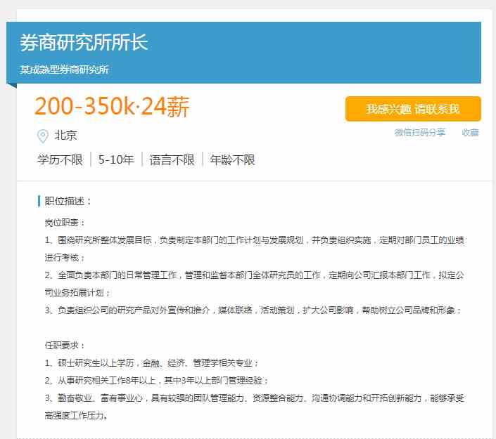 原标题:券商分析师跳槽季来了!国金首席策略李立峰转会浙商,出任研究所副所长,谁是下个佣金猎手?![]() 又到了券商分析师跳槽的季节,近期挖角频频的浙商证券再次出手。 5月21日,国金证券前首席策略分析师李立峰在公开信中宣布,正式担任浙商证券研究所副所长、首席策略分析师。 ![]() “策略团队在研究所的定位尤为重要,后续更多的研究所资源会为深度研究买单。”李立峰告诉券商中国记者,浙商证券管理层对研究所业务很重视,未来3-5年将在软硬件方面投入大量资源。众多明星分析师陆续到岗也会形成正循环,能吸引更多志同道合的分析师加盟。 进入2020年,研究所抢人大战烽烟再起,多位券商研究所首席、负责人相继转会。事实上,前有天风证券重金打造研究团队而声名鹊起,后有中泰证券、国盛证券等紧随其后,重点布局研究所已成为不少中小券商可效仿的样本路径。 李立峰加盟浙商证券研究所 5月21日,国金证券前首席策略分析师李立峰在公开信中宣布,正式担任浙商证券研究所副所长、首席策略分析师。据了解,他将主要负责全球大类资产、A股市场策略及行业配置,对接“公募、保险、银行、私募(券商资管)、国际业务”等五大类客户群体。 简历显示,李立峰系硕士研究生学历,有着10年证券从业经验。曾任东方证券研究所宏观策略组、银河基金宏观、策略及金融&家电研究员,国金证券研究所首席策略分析师。重点研究领域聚焦在“流动性、企业盈利、风险溢价率、大类资产配置以及A股、港股市场策略”等研究。 在浙商证券所长邱冠华看来,李立峰的思考角度最具买方思维,“派点长期位列研究所第一名”,这是他实力和价值的体现。而李立峰选择加盟浙商则是“从依附大平台到打造大平台,从小职业向大事业转型”的个人发展最佳策略。 “以扎实的研究、系统的框架来获取客户的信任,是卖方职业生涯的立命之本。”为此,李立峰倾向于将更多的时间、精力和资源投向研究,延续严谨客观的研究态度,不断完善逻辑体系。后续会重点推出两类深度研究产品:诸多假设条件下的数十页研究结论,以及详实的数据、清晰的推演框架,但无法短期内给出运用于投资,立即产生投资收益的“标准答案”。 此外,李立峰还表示,要注重对大类资产价格历史规律的总结,不因时间的流逝而丧失价值。在阅读历史时把握住关键节点,尽可能透彻理解,梳理出历史的脉络,并在阅读和思考的过程中,建立起自己对于历史的分析和归纳框架,从而形成自己的历史观和世界观,进而为买方客户提供有价值的研究咨询。 力争3-5年佣金分仓前五名 “对于浙商研究所投入资源,一定程度上属于二次创业,力争目标是3-5年进入佣金分仓前5名。”邱冠华曾这样规划浙商证券研究所的未来。 事实上,浙商证券也在2020年将研究作为“五个提升建设”任务的头号工程。浙商证券曾在公告中表示,随着中国金融对外开放进程的加快,券商行业竞争的加剧,研究能力已成为确保一家券商立于不败之地最重要的一项核心竞争力。 作为研究所的新任副所长,李立峰在谈到自身定位时也提到,策略团队更多的需要承担起“全球大类资产配置、风险资产定价、行业比较”等任务,需要能深度覆盖约5.0万亿公私募资金、3.5万亿保险资金、2.8万亿银行理财、2.0万亿外资资金等配置权益类资产需求。 为此,李立峰表示,策略团队在研究所的定位尤为重要,后续更多的研究所资源会为深度研究买单。而在激励政策方面,新组建的策略团队提倡付出必将得到应有收获(市场具有竞争力的薪资),坚信“1+1>2”的力量。 李立峰还告诉券商中国记者,浙商证券管理层对研究所业务很重视,未来3-5年将在软硬件方面投入大量资源。众多明星分析师陆续到岗也会形成正循环,能吸引更多志同道合的分析师加盟。 对于2020年A股市场,李立峰判断,大概率会演绎有惊无险的运行轨迹,指数平稳,但结构机会频现。2020年尽管有外围因素的扰动,但改革是不变的基调,许多逻辑仍将延续,也总有新意需求呈现,逆势托底的新型基建、周期消退后的必需消费,步入加速通过的新兴服务等等。 券商追捧研究所挖角模式 进入2020年,研究所抢人大战烽烟再起,多位券商研究所首席、负责人相继转会,其中不乏明星大咖。 以今年挖角频频的浙商证券为例,元旦当天,国泰君安新财富白金分析师邱冠华跳槽浙商证券,担任研究所所长;3月26日,原华泰证券研究所首席宏观研究员李超,赴浙商证券担任首席经济学家;4月22日,原新时代证券研究所所长邱世梁也加入浙商证券研究所,担任上海区负责人。 除此之外,5月10日,原光大证券首席经济学家彭文生接替梁红,出任中金公司研究部负责人、首席经济学家;而国泰君安研究所所长黄燕铭则被传将担任光大证券副总裁。 4月初,原申万宏源研究所17年老将、金融工程部总监杨国平更换赛道,加盟华西证券研究所。而在3月25日前后,前外管局司长、新闻发言人管涛被曝在离任中银证券独立董事后,正式履新中银证券全球首席经济学家。 事实上,前有天风证券重金打造研究团队而声名鹊起,后有中泰证券、国盛证券等紧随其后,重点布局研究所已成为不少中小券商可效仿的样本路径。在此背景下,券商研究所大手笔拉拢人才也不足为奇。 猎聘网信息显示,现有“某成熟型券商研究所”以“20万~35万*24月薪”的