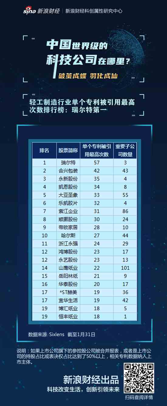 | 相关阅读 证监会发布科创板科创属性评价指标体系 专利引用次数是指已申请专利被后续专利引用的次数,通常一件专利被后续专利引用的次数越多,说明该技术越重要,技术影响越大,专利质量越好,而专利质量与专利价值和企业科技创新能力呈正相关。涉及重大创新或重大技术进步的专利,通常具有相对较高的被引用次数。专利被引用指标是客观量化衡量专利质量的国际通用指标之一。 那么,轻工制造行业的各家公司单个专利被引用最高次数究竟如何呢?「新浪财经科创属性研究中心」将为你一一解答。 Choice的数据显示,截至1月31日,轻工制造行业共有130家公司。Sixlens的数据显示,这130家公司的专利被引用总次数为21330次,其中有125家的专利有被引用,另外5家的专利没有被引用。平均而言,每家公司的专利被引用总次数为164.08次。 单个专利被引用次数前3名的公司分别是瑞尔特、合兴包装、永新股份,所对应的专利被引用次数分别为57次、42次、35次。具体而言,在瑞尔特(上市主体)的所有专利中,被引用次数最高的专利为《一种用于增强马桶虹吸负压的吸气装置》,专利申请号为“201120004086”,申请日期为2011年1月7日,被引用次数为57次,维持年限为9年。 1月31日,市值排名前3名的公司分别是欧派家居、晨光文具、顾家家居,其单个专利被引用的最高次数分别为16次、17次、8次,所对应排名分别为第22名、第21名、第65名。 以下为轻工制造行业各家公司单个专利被引用最高次数排行榜。 ![]() 附注: 1、如果上市公司旗(金麒麟分析师)下的参控股公司被合并报表,或者是上市公司的持股占比或表决权占比达到了50%以上,相关专利数据纳入上市主体。 2、资料和数据来源:上市公司公告、Wind、东方财富Choice、同花顺iFind、沪深交易所、天眼查、其他公开资料等。其中,专利相关数据来源于Sixlens(国家知识产权大数据产业应用研究基地)。(文/新浪财经 黄朋) 【上市公司科创属性系列榜单】 轻工制造行业单个专利被引用次数排行榜:瑞尔特第一 轻工制造行业发明专利申请量排行榜:大亚圣象第一 轻工制造行业发明专利授权数量排行榜:松霖科技第一 轻工制造业发明专利授权数量占比排行:岳阳林纸第一 轻工制造行业实用新型专利申请量排行榜:瑞尔特第一 轻工制造行业同族专利数量排行榜:松霖科技第一 轻工制造行业外观设计专利申请量排行榜:老凤祥第一 轻工制造行业有效发明专利排行榜:松霖科技第一 轻工制造业有效发明专利维持年限排行:紫江企业第一 轻工制造行业专利被引用总次数排行榜:松霖科技第一 轻工制造行业专利申请总量排行榜:老凤祥第一 轻工制造行业专利授权总量排行榜:老凤祥第一 海量资讯、精准解读,尽在新浪财经APP 责任编辑:黄朋 |