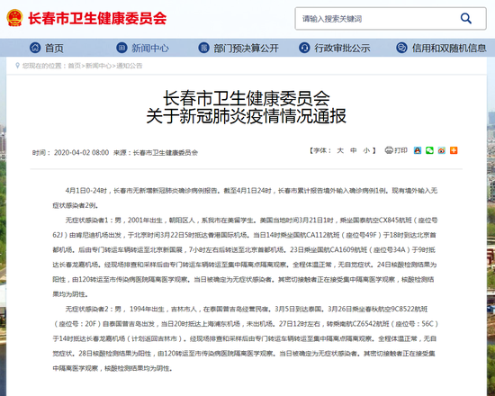 ![]() 4月1日0-24时,长春市无新增新冠肺炎确诊病例报告。截至4月1日24时,长春市累计报告境外输入确诊病例1例。现有境外输入无症状感染者2例。 无症状感染者1:男,2001年出生,朝阳区人,系长春市在美留学生。美国当地时间3月21日1时,乘坐国泰航空CX845航班(座位号62J)由肯尼迪机场出发,于北京时间3月22日5时抵达香港国际机场。当日14时乘坐国航CA112航班(座位号49F)于18时到达北京首都机场。后由专门转运车辆转运至北京新国展,7小时左右后转送至北京首都机场。23日乘坐国航CA1609航班(座位号34A)于9时抵达长春龙嘉机场。经现场排查和采样后由专门转运车辆转运至集中隔离点隔离观察。全程体温正常,无自觉症状。24日核酸检测结果为阳性,由120转运至市传染病医院隔离医学观察。当日被确定为无症状感染者。其密切接触者正在接受集中隔离医学观察,核酸检测结果均为阴性。 无症状感染者2:男, 1994年出生,吉林市人,在泰国普吉岛经营民宿。3月5日到达泰国。3月26日乘坐春秋航空9C8522航班(座位号:20F)自泰国普吉岛出发,当日20时抵达上海浦东机场,未出机场。27日12时左右,转乘南航CZ6542航班(座位号:56C)于14时抵达长春龙嘉机场(计划返回吉林市)。经现场排查和采样后由专门转运车辆转运至集中隔离点隔离观察。全程体温正常,无自觉症状。28日核酸检测结果为阳性,由120转运至市传染病医院隔离医学观察。当日被确定为无症状感染者。其密切接触者正在接受集中隔离医学观察,核酸检测结果均为阴性。 (来源: 长春市卫生健康委员会) 专题:众志成城 共克时艰——关注吉林省新冠肺炎疫情 专题:复工复产吉林进行时 |