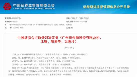 | 又有31家私募被注销 赖账证监会4000万的名列其中 又有31家私募被注销! 被注销的私募各个各的故事,有10年私募老兵,也有轰轰烈烈做艺术品投资的其他类私募。其中最有故事的还是裕鼎投资。创始人从气象局职员转投私募行业,之后因操纵市场被证监会处罚,还拒不缴纳证监会罚款,被法院强制执行,公司更换大股东,最终,裕鼎投资以被注销告别私募江湖。 曾赖证监会4000万罚款不还 裕鼎投资被注销 近日,裕鼎投资出现在中基协最新公布的因失联被注销的私募基金管理人名单上,这家有故事的一方游资,就此在资本市场画上句号。 在被中基协注销的私募中,受到过监管处罚的不鲜见,但是,像裕鼎投资这样因操纵股价被罚几千万,还能赖账不交罚款的不多。 2019年6月19日,法院作出判决,准予强制执行中国证券监督管理委员会作出的[2018]96号《行政处罚决定书》中对广州市裕鼎投资有限公司的处罚决定。 ![]() 法院执行裁定书显示,中国证券监督管理委员会于2018年10月11日作出96号《决定书》,于2018年10月29日送达广州市裕鼎投资有限公司。96号《决定书》现已经发生法律效力,广州市裕鼎投资有限公司经催告后仍未履行。 2019年9月6日,法院给裕鼎投资和大股东吴平荣下发了限制消费令,限制其高消费。限高令显示,裕鼎投资未履行的金额为5511.6万元。 ![]() 裕鼎投资欠证监会的这笔罚款发生在2018年,是因为操纵“湘油泵”被罚了4129万元。而天眼查上裕鼎投资公布的2018年年报显示,公司的利润总额是-1006.27万元。 ![]() 操纵“湘油泵”股价获利1376万元 根据2018年证监会发布的处罚公告,2016年12月27日至2017年2月9日期间,裕鼎投资控制账户组,操纵“湘油泵”的股价,累计买入1981.9万股,买入金额10.9亿元,卖出1981.89万股,卖出金额11.05亿元,扣除交易税费后获利1376.45万元。在2017年2月8日,裕鼎投资持有“湘油泵”流通股占比比达到最高,为14.57%。 ![]() 裕鼎投资是怎么操纵股价的呢? 一是集中资金优势、持股优势连续买卖。账户组在18个交易日存在既有买入又有卖出“湘油泵”的行为。在有买入行为的23个交易日中,申买笔数共计2012笔,其中1366笔委托的买入价格高于委托前一刻市场成交价,最高价差高达4.7元,且在多个交易日中多次委托买入价格甚至高于委托前一刻卖委托第5档价格,或委托买入量高于委托前一刻市场前5档卖出委托总量。 二是对倒交易。在多个交易日存在以高于买委托前一刻卖委托第1档价格、甚至高于买委托前一刻卖委托第5档价格对倒成交的情形。 三是涨停板虚假申报。在涨停价买盘远大于卖盘的情况下,反复、大量以涨停价申报买入“湘油泵”,申报后较短时间内,账户组进行撤单,之后再次申报买入并撤单。 湘油泵”在2016年11月30日登陆沪市主板,新股上市曾一连收获15个涨停板,股价从10.46元一路涨到60元附近。2016年12月27日至2017年2月9日,湘油泵的股价在41.91元/股至62.9元/股的区间内波动。 对于这种操纵股价的行为,证监会不仅对公司做出处罚,还对其直接责任人一并处罚。裕鼎投资被没收违法所得1376.45万元,并处以4129.36万元的罚款。此外,公司股东和法定代表人江瑜被给予警告,并处以60万元的罚款;参与选股决策并实施配资、下单行为的直接责任人员胡菊华被给予警告,并处以30万元的罚款;参与决策选股并负责财务工作的吴惠玲被给予警告,并处以10万元的罚款。 从气象局转身私募 一方游资黯然收场 从此前基金业协会的备案信息显示,广州市裕鼎投资有限公司成立时间为2006年04月17日,注册资本1130万元。2014年5月20日在中国基金业协会进行了备案登记,机构类型为“私募证券投资基金管理人”。法定代表人江瑜没有取得基金从业资格。 负责选股、风控,且在盘中交易时进行指导的裕鼎公司法人、股东江瑜,出生于1964年,1984年至2007年为广东省气象局职员。2007年至2014年任广州市裕鼎投资有限公司董事长。 其已成立的基金有两只,分别为“天津市太阳帆投资管理合伙企业(有限合伙)”、“天津市大伊万投管理合伙企业(有限合伙)”。据金斧子网,“太阳帆投资基金”成立于2011年11月份,2016年5月末最后一次公布单位净值为2元,基金经理为江伟。 在2018年被证监会处罚后,裕鼎投资退出资本市场的命运已经显出端倪。 2019年3月份开始,吴惠玲、江瑜退出股东名单,吴平荣进入,成为大股东,吴平荣共出资1017万元,持股90%,另一位股东为宁旭辉,持股10%。2019年11月8日,裕鼎投资出现在疑似失联私募名单中。 ![]() 2019年12月26日,广州市工商行政管理局越秀分局将其列为经营异常名录,通过登记的住所或者经营场所无法联系。 多家私募去年就疑似失联 “10年老兵”、艺术品私募也被注销 除了被证监会大力处罚的裕鼎投资,在此次失联名单中,还有成立10年之久的老牌私募北京世纪利伟投资、北京邦诺投资投资。 此外,还有做艺术品投资的其他类私募北京盛世瑰宝艺术品投资也在注销名单之中。工商资料显示,北京盛世于2010年2月25日注册成立,注册资本为1000万元,公司大股东为陈连勇。今年10月11日,该公司已经注销,注销原因为协议解散。 北京盛世发行的基金也曾在艺术品基金市场受到关注。据21世纪报道,在成立北京盛世之前,北京盛世的大股东陈连勇曾在北京艺术博物馆任职,随后在中国嘉德国际拍卖有限公司任职14年,主管瓷器工艺品部。 2011年5月,北京盛