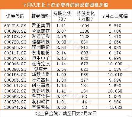 | 川财中期策略会许慧敏:周期资源类业绩修复,新材料发展可期 掘金大消费张宇光(金麒麟分析师):把握确定性成长标的,寻找边际改善投资机会 中信建投黄文涛:下半年宏观经济和固定收益投资展望 嘉实陶荣辉、大V望京博格:被股市震的心慌?专家给你出招 申万王胜(金麒麟分析师)、安信杨勇、富国王乐乐:上证指数改革落地,A股“长牛”号角响起? 行情震荡该如何持基?基金经理在线解答投资者的问题! 大成基金苏秉毅:论技术分析是否有效 兼谈下半年投资方向 川财2020中期策略会能源:需求持续改善、政策助力发展 掘金大消费赵浩然:政策持续推进,产业重构正当时 汇添富过蓓蓓、卞正:乘风破浪的新能源车投资机遇展望 原标题:投资情报丨北上资金提前扫货蚂蚁集团概念股,6只今日涨停!最近还加仓了这些股 来源:21世纪经济报道 7月21日,受蚂蚁集团正式启动IPO消息影响,蚂蚁金服概念股上演涨停潮,截至收盘,17只蚂蚁金服相关概念股涨停,其中有6只获北上资金提前扫货。 ![]() 蚂蚁集团官宣上市,北上资金出货恒生电子 7月21日,北上资金净流出30.11亿元。其中,蚂蚁集团概念股之一的恒生电子被净卖出4.95亿元。除此之外,中国平安净卖出6.83亿元,海螺水泥净卖出5.69亿元,五粮液净卖出4.73亿元;而格力电器被净买入8.66亿元。 ![]() 北上资金提前扫货16只蚂蚁集团概念股 事实上,在蚂蚁集团正式宣布启动IPO前夕,7月1日到7月20日,作为市场的聪明资金,北上资金增持了多只蚂蚁集团概念股,其中,增持超千万股的有君正集团、承德露露、财通证券,分别增持4004万股、1188万股、1128万股。 ![]() 除了蚂蚁集团概念股,北上资金还增持了这些股: ![]() ![]() (作者:叶映橙) 海量资讯、精准解读,尽在新浪财经APP 责任编辑:张熠 |