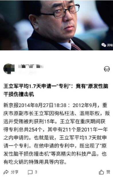 所以一看这个专利名称,就令人无限恐怖。 如果这种发明专利,运用到审讯环节,已经超越对整个人类历史恐怖的想像。 还有什么审讯,比把人的脑子撞坏却又让人活着更恐怖?在这种审讯之下,还有什么笔录做不出来?还有什么人不能精准地整成不同程度的废人? 而这种申请专利又可以得到通过,也暴露出一个重要的盲点,那就是所有专利申请,需不需要伦理审核? 一些违背人类伦理、伤害社会公序良俗的专利,如果没有伦理审核,不应该被授权。 王立军在重庆期间,特别是2011年,一年时间就申请了211个专利,平均1.7天申请一件专利,哪怕大发明家爱迪生重生,也会羞愧得再次死去。