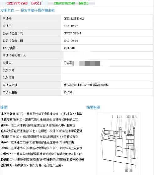 就像他哪怕客串一下书法,都已有超越王羲之,睥睨书法界的气象,看看围观者无不膜拜叹服之态便知。 那么王立军的发明专利又是些什么呢?原来很多与他的工作相关。 譬如在审讯的时候,如何做到高效便捷?于是他苦思冥想,申请了一项专利——原发性脑干损伤撞击机。 什么是原发性脑干损伤撞击机?通俗点就是通过对脑袋的撞击让脑干损伤的机器。而脑干是感觉和运动纤维的传导通路及心血管中枢、呼吸中枢的所在部位。对人的重要性不言而喻。 什么是原发性脑干损伤呢?百度百科解释是: 头部受到打击或身体其他部位受到撞击,可使脑干撞击在小脑幕裂孔的切迹缘上或枕骨的斜坡上,或沿纵轴向下剧烈移动或扭转而造成脑干的损伤;或头部外伤导致颅骨严重变形,通过脑室内脑脊液冲击造成中脑导水管周围或四脑室底的损伤。原发性脑干损伤常合并有大脑半球弥漫性损伤。