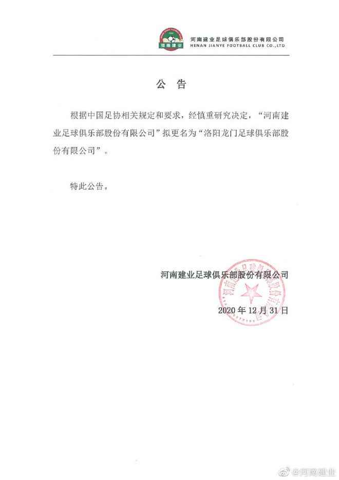 | 12月31日报道: 今天,河南建业俱乐部官方发公告,宣布俱乐部拟更名为“洛阳龙门足球俱乐部股份有限公司”。