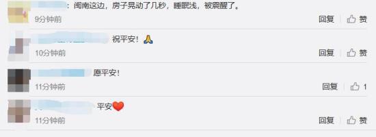 有网友表示,“闽南这边,房子晃动了几秒,睡眠浅,被震醒了。”