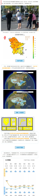 前天宁波大部分地区最高气温突破1月上旬(1月1日—1月10日)历史同期极值。昨天下午强冷空气影响宁波,气温将剧烈下降。