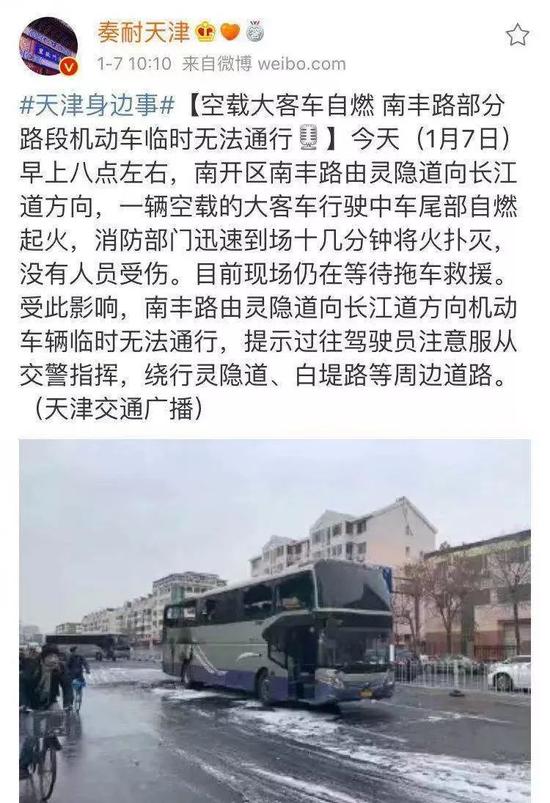 突发!!今晨8点左右,义兴南里公交站附近一辆大巴车尾起火。 ![]() 从现场的照片看,大客车停在马路中央。 车身火苗高高蹿起,燃烧产生的浓烟滚滚飘向天空! ![]() 现场已有消防队在救火。 大家都担心有没有人员伤亡 你好黄二狗:窗边眼镜两兄弟都不抬眼看的。。。。 阳光下030你幸福的微笑:希望人没事 潇寒紫月:车里有个灭火器挺重要 失去了睡眠_Zz-:没有人员伤亡,车上只有司机一人 Somnus_wae:我楼下?? 想文艺范儿的猫:人没事儿吧?都下来了吗? 9点一过,有网友发来消息, 南丰路与长江道交口, 大客的火已经被扑灭了, 建议大家绕行。 ▼ ![]() 万幸! 消防部门迅速到场将火扑灭, 没有人员受伤。 ![]() 据了解,司机今早从南丰路与西湖道交口出发,刚刚发出10余分钟,车上还没有载客,突然感觉车辆“开不起来”,刚过灵隐道到达泰达清新园小区门口时,发现了车辆后排冒烟,于是拿出车上备有的灭火器进行扑灭,无奈灭了又起,火势无法控制,只好选择下车拨打火警。 据南开消防介绍,消防今天早上8:04接警,2分钟到达现场,当时车辆尾部和后排座已经引燃。车上没有人员,司机也在车下,8分钟之后火势得到控制,没有人员伤亡,目前事故原因还在调查当中。 ![]() [实时路况] 南丰路灵隐道至长江道路段,路面结冰, 南开交警提示过往机动车驾驶员注意减速慢行, 避免急打方向、猛踩刹车等行为,跟车有序通行。 部分来源:津云、天津交通广播、@天津南开交警白堤路大队 |