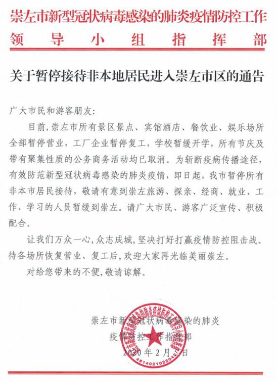 关于暂停接待非本地居民进入崇左市区的通告 广大市民和游客朋友: 目前,崇左市所有景区景点、宾馆酒店、餐饮业、娱乐场所全部暂停营业,工厂企业暂停复工,学校暂缓开学,所有节庆及带有聚集性质的公务商务活动均已取消。为斩断疫病传播途径,有效防范新型冠状病毒感染的肺炎疫情,即日起,我市暂停所有非本市居民接待,敬请有意到崇左旅游、探亲、经商、就业、工作、学习的人员暂缓到崇左。请广大市民、游客广泛宣传、积极配合。 让我们万众一心,众志成城,坚决打好打赢疫情防控阻击战。待各场所恢复营业、复工后,欢迎大家再光临美丽崇左。 对给您带来的不便,敬请谅解。 崇左市新型冠状病毒感染的肺炎疫情防控工作指挥部 2020年2月5日 ![]() 推荐阅读 来源:崇左市新型冠状病毒感染的肺炎疫情防控工作指挥部 编辑:韦邦慧 |