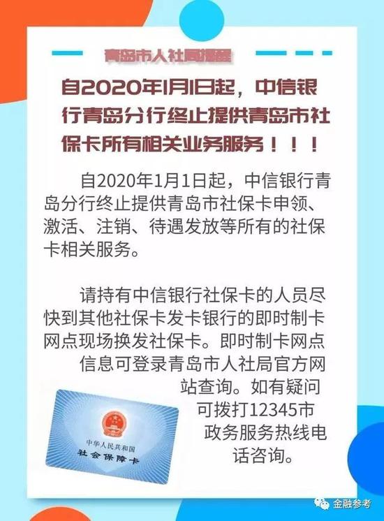 ![]() 鲁网1月16日讯(记者张润邦)鲁网记者获悉,中信银行股份有限公司青岛分行(下称中信银行青岛分行)已停办社保卡所有相关业务,对此,青岛市人社局发文提醒市民尽快换卡。 2020年1月15日,青岛市人社局发布消息称,自2020年1月1日起,中信银行青岛分行终止提供青岛市社保卡申领、激活、注销、待遇发放等所有的社保卡相关服务。 青岛人社局同时称,“请持有中信银行社保卡的人员尽快到其他社保卡发卡银行的即时制卡网点现场换发社保卡。即时制卡网点信息可登录青岛市人社局官方网站查询。” 去年12月17日,青岛市社会保险事业中心社会保障卡管理处处长卢永华参加“在线问政”栏目时曾指出,青岛市社保卡有8家合作银行,分别是:中国工商银行青岛市分行、中国农业银行青岛市分行、中国银行青岛市分行、中国建设银行青岛市分行、交通银行青岛分行、青岛银行、青岛农村商业银行、招商银行青岛分行,合作银行的任意营业网点均可办理社保卡业务。 |