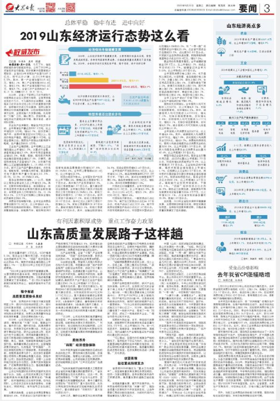 ![]() 有利因素积厚成势 重点工作奋力攻坚 山东高质量发展路子这样趟 2020-01-22来源:大众日报 03版 □ 本报记者 代玲玲 毛鑫鑫 方 垒 孙源泽 经济总量突破7.1万亿元,GDP增速5.5%;服务业主引擎作用凸显,对经济增长的贡献率达78.2%;“四新”经济投资占比达到44.8%;高技术制造业增加值比上年增长1.7%……这是2019年山东经济交出的成绩单。 “2019年全省经济保持平稳健康发展,主要预期目标基本实现,转型发展成效明显,各种有利因素积厚成势,为推进高质量发展奠定了坚实基础。”在1月21日省政府新闻办新闻发布会上,省政府副秘书长于成河说。 稳中有进 高质量发展势头良好 “去年,世界经济中不稳定不确定因素明显上升,国内外风险挑战明显上升。面对这样的复杂局面,山东经济能实现总体运行平稳,确实来之不易。”澳门大学社会科学学院院长胡伟星说,如果从发展质量和效益的视角来衡量,这份成绩单成色十足。 2019年,山东顶住经济下行压力,超前谋划、精准实施“六稳”30条、稳就业20条、稳外资21条、稳外贸25条、拓展消费市场12条、支持数字经济发展19条、支持企业家干事创业25条,助力企业轻装上阵,经济运行处于合理区间;保持高质量发展定力,坚定不移推动新旧动能转换,自我加压推动钢铁、焦化、地炼、电解铝等高耗能行业转型升级,高质量发展迈出新步伐;全面增强改革开放动力,扎实推进“扩权强县”、开发区体制机制等12个领域改革,形成制度创新、流程再造成果70多个,成功举办首届跨国公司领导人青岛峰会等重大活动,获批中国(山东)自由贸易试验区、中国—上合组织地方经贸合作示范区,改革开放实现新突破;广泛凝聚狠抓落实合力,推动高质量发展的信心决心越来越笃定。 山东社科院国际经济研究所副研究员刘晓宁认为,当前,山东经济发展正处于新旧动能转换和向高质量发展转变的“阵痛期”,经济增速相比过去有所放缓。但与此同时,山东经济正在发生诸多趋势性、关键性变化,积极特征、有利信号正在加速汇集。 从需求结构看,全省社会消费品零售总额增长6.4%,外贸进出口在外部环境十分严峻的情况下实现增长5.8%,经济增长由主要依靠投资拉动加快向依靠三大需求协调拉动转变,消费成为经济增长的主动力。 从产业结构看,全省“十强”产业培育加快突破,“四新”经济加快发展,投资占比达到44.8%,新动能成长态势更加明显。 从创新创业看,我省深入实施大科学计划和大科学工程,布局建设22家“政产学研金服用”创新创业共同体,启动了51个重大基础研究项目。加速建设重大创新平台,山东产业技术研究院、高等技术研究院、能源研究院揭牌成立,中科院海洋大科学中心启动建设。高新技术产业产值占工业总产值的比重达到40.1%,比上年提高3.2个百分点。 值得关注的是,重大项目支撑加力。前两批865个新旧动能转换优选项目、104个省重大建设项目,分别完成投资2407亿元和1172亿元以上。重大基础设施建设全面提速,沿海港口、运输机场资源整合迈出实质步伐,4条高铁开工建设,鲁南高铁日照至曲阜段建成通车;5条高速公路开工建设,9条高速公路建成通车。海阳核电一期、山东—河北特高压交流环网等重大能源工程建成投运。 “2019年,山东经济发展的高质量特征愈发显现,产业结构持续优化、需求结构更趋合理、创新绿色发展水平得到提升。”刘晓宁表示,经过结构优化和动能转换,山东经济内部已经积蓄了更加强大的势能和后劲,这些都为高质量发展的持续健康推进夯实了坚实基础。 质效齐升 “四新”经济增势强劲 2020年是我省新旧动能转换初见成效的决战决胜之年,要加快淘汰落后动能、改造提升传统动能、培育壮大新动能。从2019年的具体数据看,山东新动能正在积厚成势,新旧动能转换正在向“三年初见成效”加速迈进。 “加快实施新旧动能转换重大工程是促进全省经济高质量发展的重要抓手。”省发展改革委副主任关兆泉表示,过去一年,我省把培强做优“十强”产业作为主抓手,坚持存量优化和增量崛起共进,集中力量抓优选项目和“双招双引”重大签约项目,先后分两批谋划和筛选新旧动能转换优选项目865个,重点调度省市“双招双引”重大签约项目152个。 去年12月,魏桥创业集团与云南共同建设绿色铝创新产业园暨200万吨绿色水电铝项目在云南开工。在转移产能的同时,魏桥在滨州重新布局200多万吨再生铝生产项目,打造全国的再生铝循环产业基地,仅此一项就可减少滨州1000万吨煤炭消费量,腾出了巨大的发展空间和环境容量。 “动能转换需要形成压旧上新、压小上大、压低上高、压散上整的长效机制。”滨州市委书记佘春明说,滨州立足发展根底,推动五大千亿级产业集群从“规模最大”向“价值最优”转型升级,着力打造世界高端铝业基地、世界级高端化工基地、世界级高端纺织基地等。 优势产业转型提升的同时,新兴产业也加快培育。去年12月,总投资15亿元的全省首个海上风电产业园项目在海阳市破土动工。据介绍,一期工程主要建设海上风机制造中心,用于生产5MW以上海上智能风机,预计产能可达到300套/年。这是继实现核能商业供热后,海阳打造的新能源产业又一重要板块。“作为山东新旧动能转换综合试验区三个核心区之一,2019年,烟台集中力量培育了一批新兴产业,落地了一批‘四新’项目,成长了一