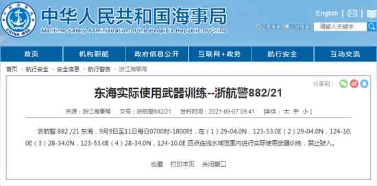 浙航警 882 /21 东海,9月9日至11日每日0700时-1800时,在(1)29-04.0N,123-53.0E(2)29-04.0N,124-10.0E(3)28-34.0N,123-53.0E(4)28-34.0N,124-10.0E 四点连线水域范围内进行实际使用武器训练,禁止驶入。