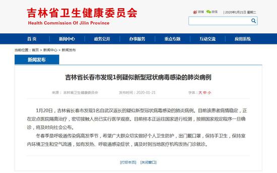 ![]() 1月20日,吉林省长春市发现1名自武汉返长的疑似新型冠状病毒感染的肺炎病例。目前该患者病情稳定,正在定点医院隔离治疗,密切接触人员已实行医学观察。目前样本正运往国家进行检测,按照国家规定程序一旦确诊,将及时向社会公布。 冬春季是呼吸道传染病高发季节,希望广大群众切实做好个人卫生防护,出门戴口罩,保持手卫生,保持室内环境卫生和空气流通,如有发热、呼吸道感染症状,请及时到当地医疗机构发热门诊就诊。 ![]() ![]() (来源:吉林省卫生健康委员会) |