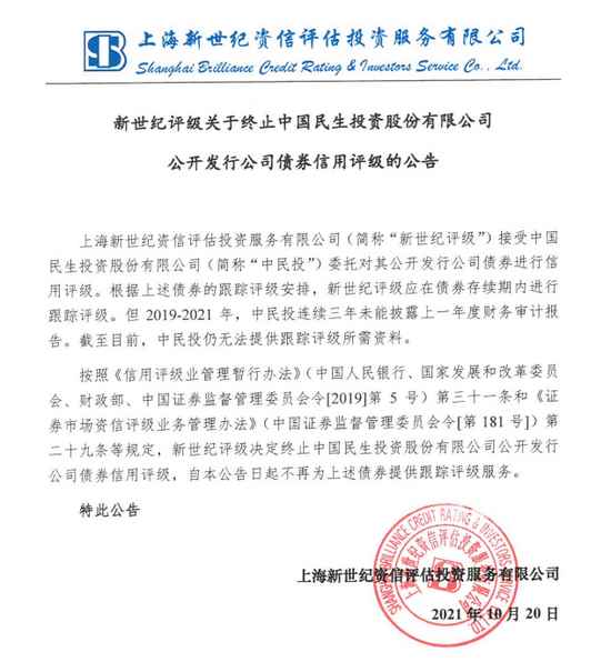 新世纪评级公告,2019-2021年,中国民生投资股份有限公司连续三年未能披露上一年度财务审计报告。截至目前,中民投资仍无法提供跟踪评级所需资料。新世纪评级决定终止中国民生投资股份有限公司公开发行公司债券信用评级,自2021年10月20日起不再为上述债券提供跟踪评级服务。