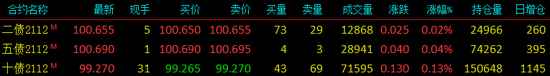 2021年10月28日,国债期货各品种主力合约全线上涨。截至下午收盘,十年期主力合约涨0.13%;五年期主力合约涨0.04%;二年期主力涨0.02%。