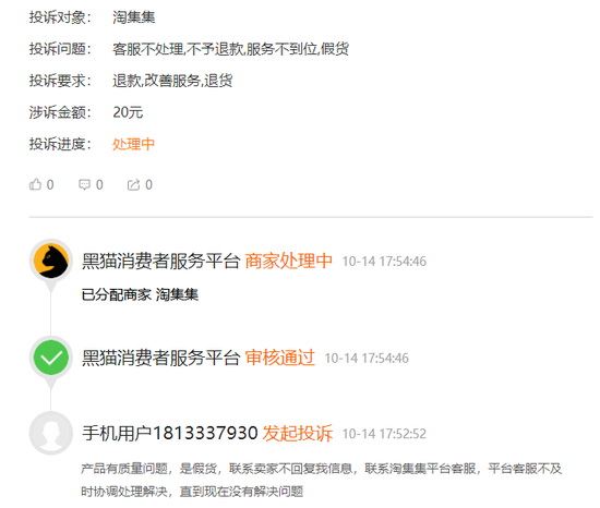 近日,黑猫投诉河北站收到网友投诉淘集集:产品有质量问题,是假货,联系卖家不回复我信息,联系淘集集平台客服,平台客服不及时协调处理解决,直到现在没有解决问题。