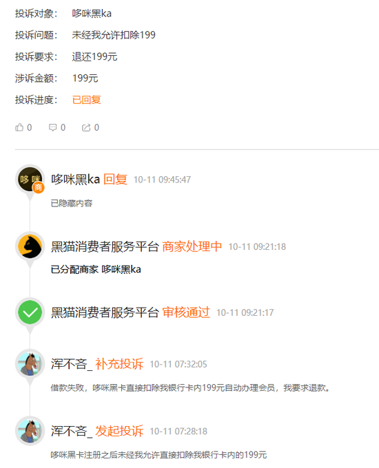 网友投诉哆咪黑ka:哆咪黑卡注册之后,未经我允许,直接扣除我银行卡内的199元。